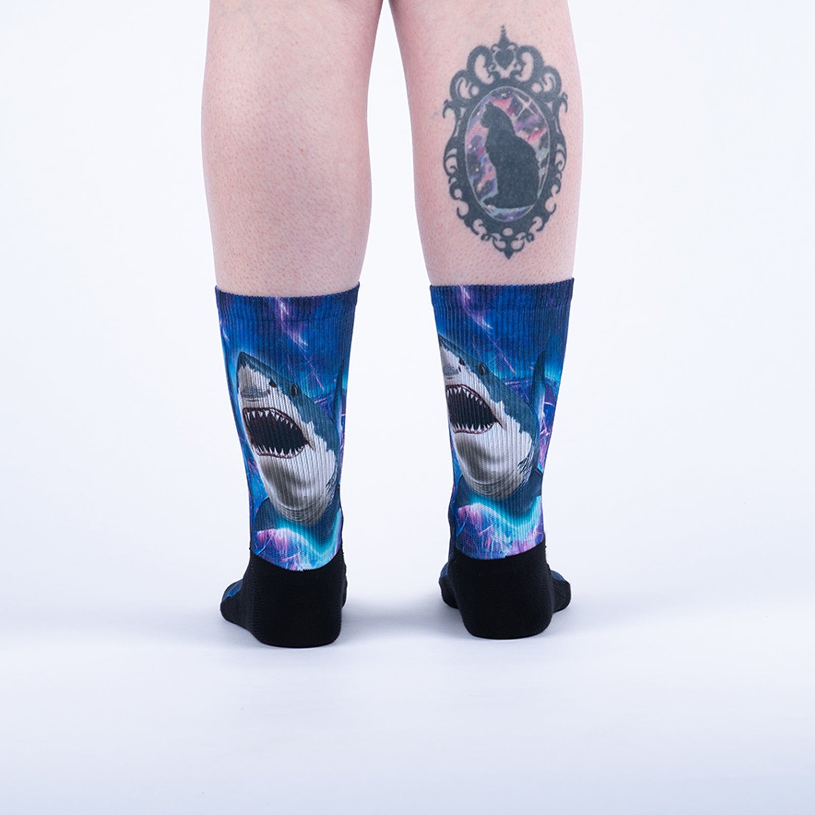 A shark explodes through neon fractals in this jaw-dropping design. Part sci-fi, part sea life—these socks are for feet that refuse to play it safe.